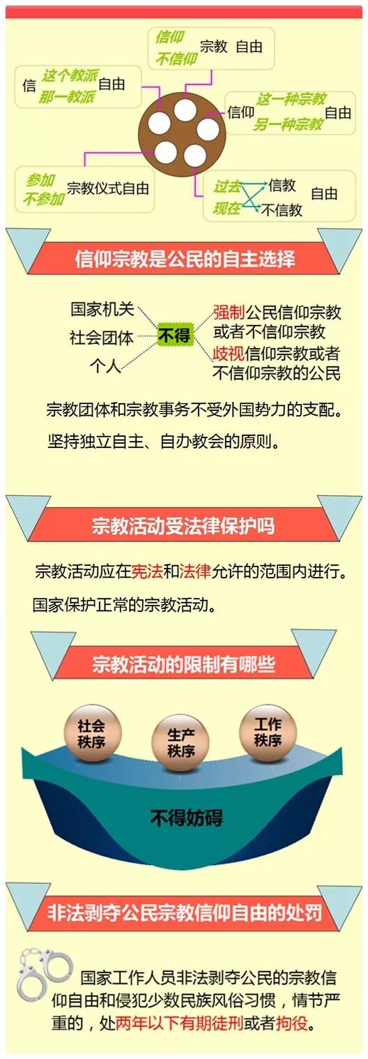 概况地说:每个公民有信仰宗教的自由,也有不信仰宗教的自由;有信仰这种宗教的自由,也有信仰那种宗教的自由;有过去不信教而现在信教的自由,也有过去信教而现在不信教的自由。国家尊重和保护公民信教的自由,也尊重和保护公民不信教的自由,这是最基本的内容。
